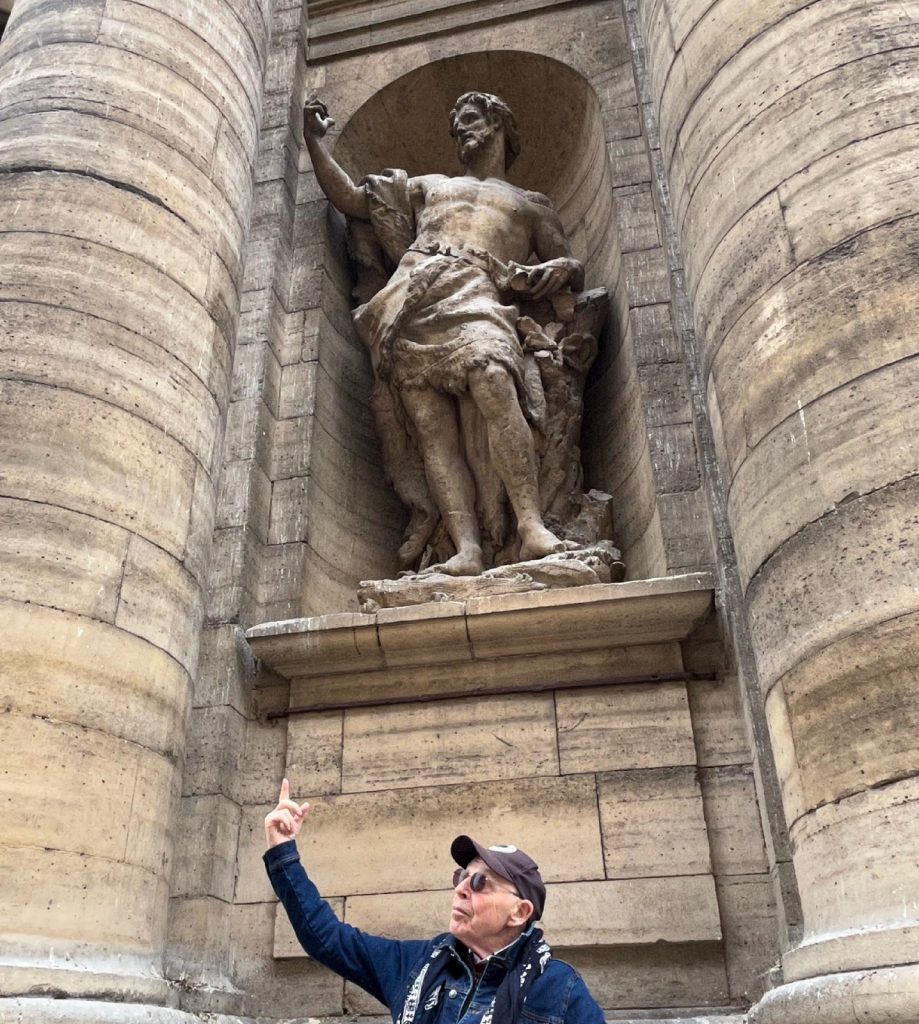 And from St Sulpice, the church at the centre of heresies in Paris, where several interesting inside features have been talked about, but nobody mentions that outside to the right is a massive picture of number one with of course his finger raised.