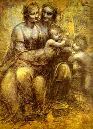 And we are told there is an apocryphal story that Jesus met with the Baptist in Egypt, and that is the moment portrayed in the painting. But is it? The brief from the commissioners suggested a nativity scene, and furthermore there is no apocryphal story of a meeting between John and Jesus. It was invented to explain the painting and did not exist before the painting. Look at the London version, where somebody has added the Baptist symbol of the cross to one of the babies. The trouble is that if that is the Baptist, he looks about six months old. And if he is six months old, then Jesus has just been born so would be a babe in arms, but he also looks about six months old! Now we are getting to the real mystery. Perhaps you could argue that Leonardo made a mistake painting them the same age, but Leonardo knows something that was known in esoteric circles. Look at Leonardo’s Burlington House Cartoon.