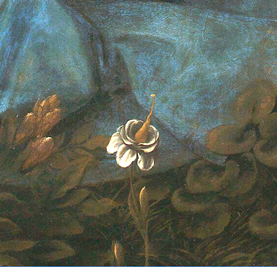 While Leonardo may have toned down his hand of God in his second London version, he has added at the foot of the virgin, the flower of the bridal bouquet, an arum lily with a very erect stamen pointing directly to certain parts of the virgin