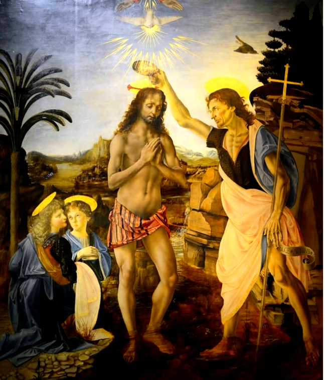 And it was not just Leonardo who seems to know this, but his master, Andrea del Verrochio, painted Jesus with a very interesting Baptist in 1472.