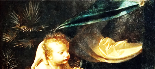 So master and apprentice have painted the Baptist some seven years older than Jesus, so that raises the question, who are the two babies in the Virgin of the Rocks? We know the brief from the Confraternity of the Immaculate Conception, and it was to be the Virgin Mary and Christ child, with two prophets, surrounded by angels. Above them was to be a lunette containing a relief panel of God and the Virgin Mary, beneath which was a panel showing the crib. So they were not asking for a painting of the ‘Flight into Egypt’, which every expert says this painting is about; they were asking for a painting of the birth of Jesus with his crib. And there certainly was no desire for John the Baptist in the painting.