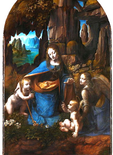 ‘Leonardo’s mysterious painting shows the Virgin Mary with Saint John the Baptist, Christ’s cousin, and an angel. All kneel to adore the infant Christ, who in turn raises his hand to bless them. They are crowded in a grotto overhung with rocks and dense with vegetation. The painting was part of a large, elaborate altarpiece made for the church of San Francesco Grande, Milan, to celebrate the Immaculate Conception of the Virgin Mary.