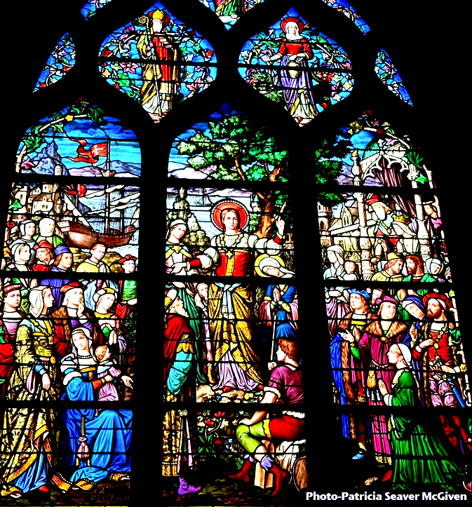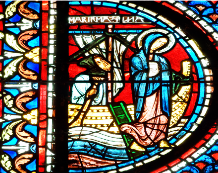 There is no story in the Bible that tells us about a boat journey the Magdalene took. Where has she travelled to? And who is this person, dressed as a bishop, preaching in the Magdalene window? He is even shown present in a panel of her death. How does he relate to the Magdalene?