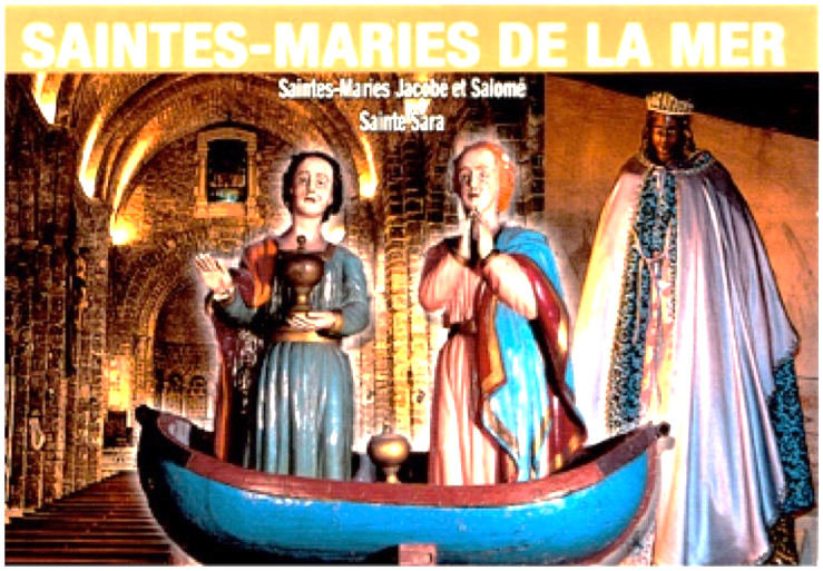 Which Mary is missing from this tableau? Why, the Magdalene, of course! A town and a church dedicated to her landing has had her removed. I could not believe my eyes, and in the tourist shop outside I resented paying three euros, but I had to buy this postcard of the outrage. See, it says Mary Jacob and Mary Salome and even the servant Sara, but no Mary Magdalene!