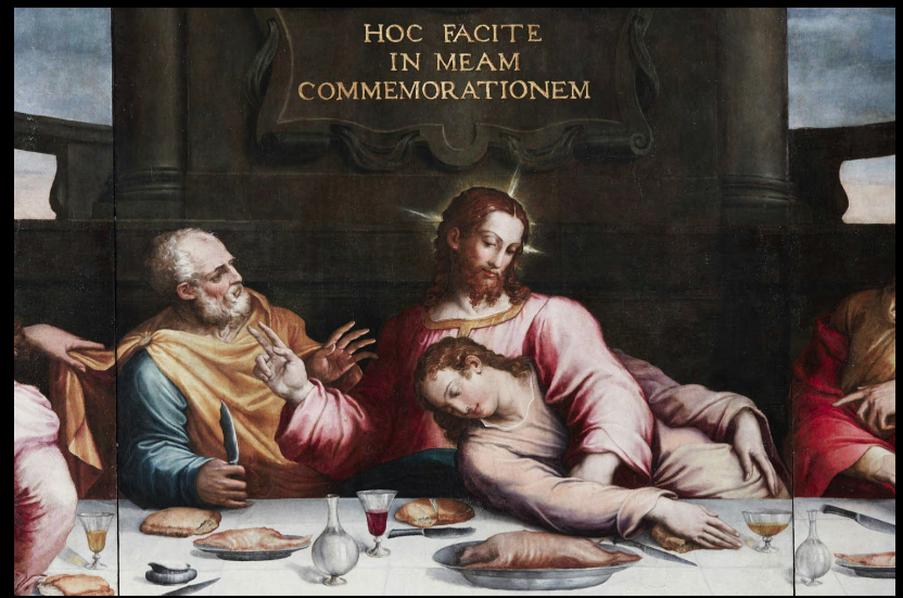This painting looks like the beloved disciple has either dropped his fork or is doing something rude to Jesus. Sometimes the beloved disciple is shown asleep, which is rather strange, as he is chatting to Peter; other paintings show him as a small boy sitting on Jesus’ lap. I love this one where he is both a boy and asleep.